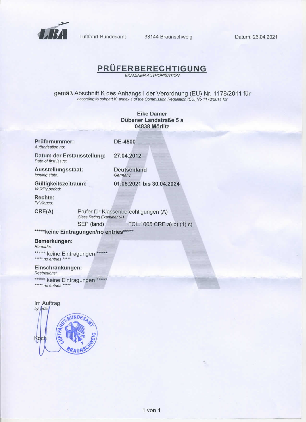 Lehrberechtigung PPL- A, CRE (A) Nr.: DE.4500